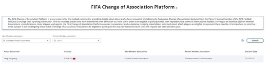 05月20日讯 国际足联协会变更平台官网显示,成都蓉城中场杨明洋的成都会籍由瑞士足协变更成中国足协。