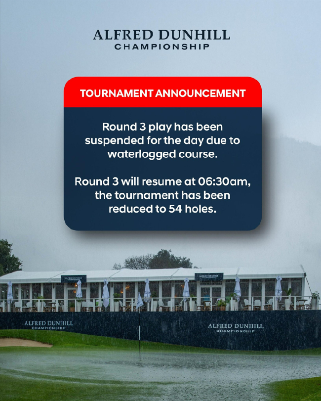 为避开预报的天气降雨,皇家约翰内斯堡俱乐部的缩短开球时间已提前至清晨,共有40名选手得以开始他们的为洞第三轮比赛。然而,登喜第日在选手最多完成不超过6洞后,标赛又一场大雨迫使比赛再次暂停。遭遇